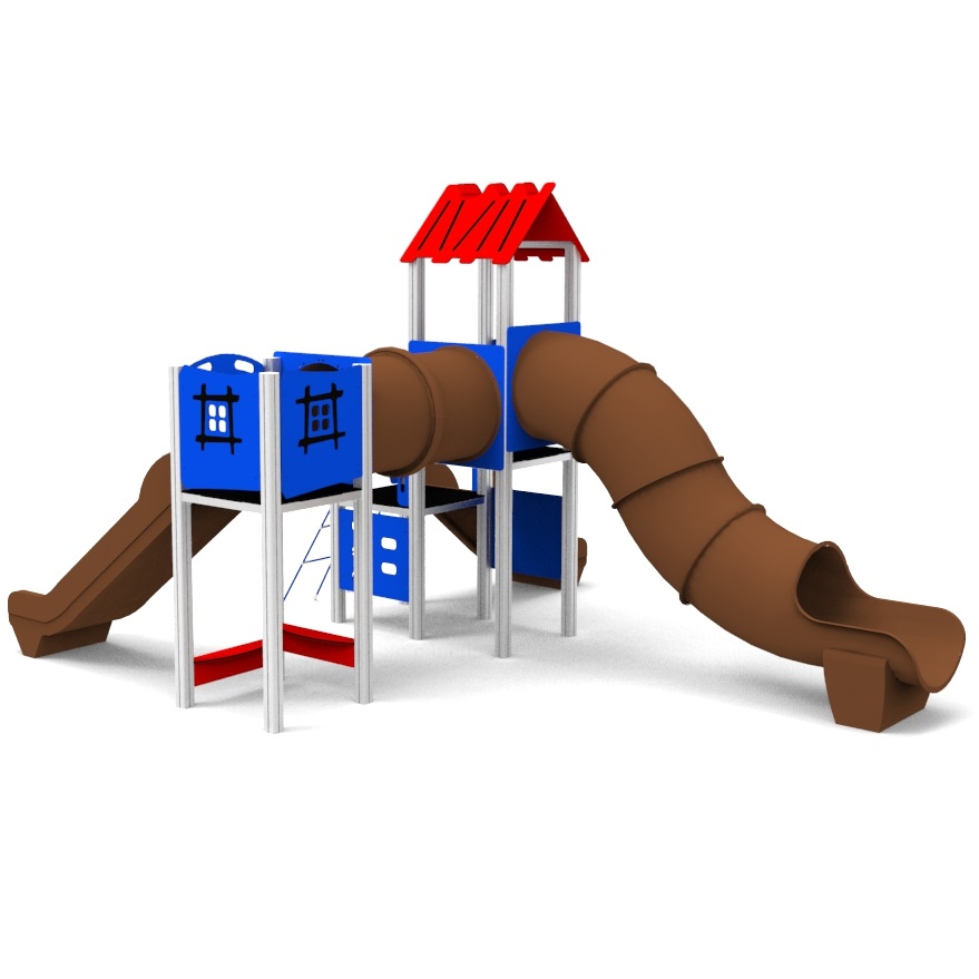 Structural poles: Aluminium profile 90x90 mm with eloxed surface, Platforms / stairs: 12mm anti – slip HPL sheet, with stainless steel supports, Handles and bars: stainless steel 304 or 316 grade, Roof, side panels, walls: UV stabilised 3-layer, bi-color HDPE with inner 100% recycled core in 12, 15 or 19mm thickness. Slide: UV-stabilised Polyethylene (PE), Screws and connecting material: Rope: 16mm PE rope with steel reinforcement