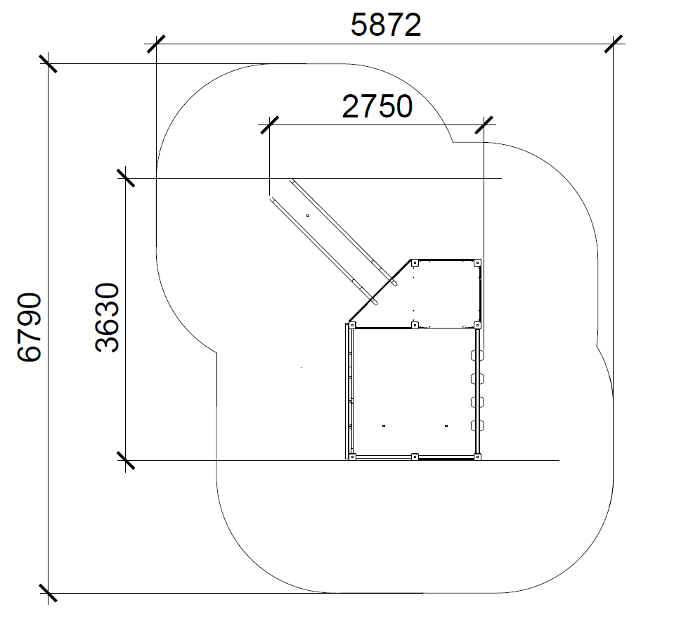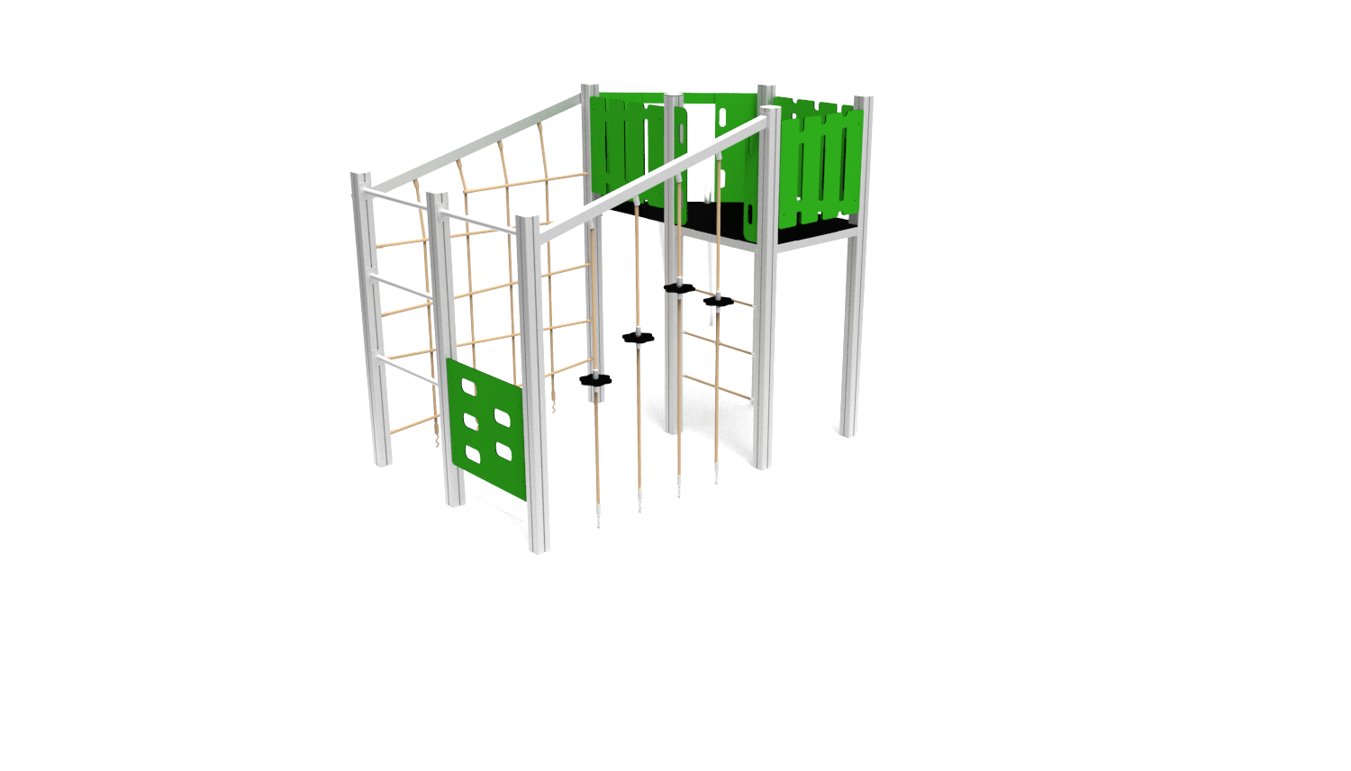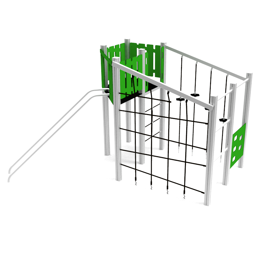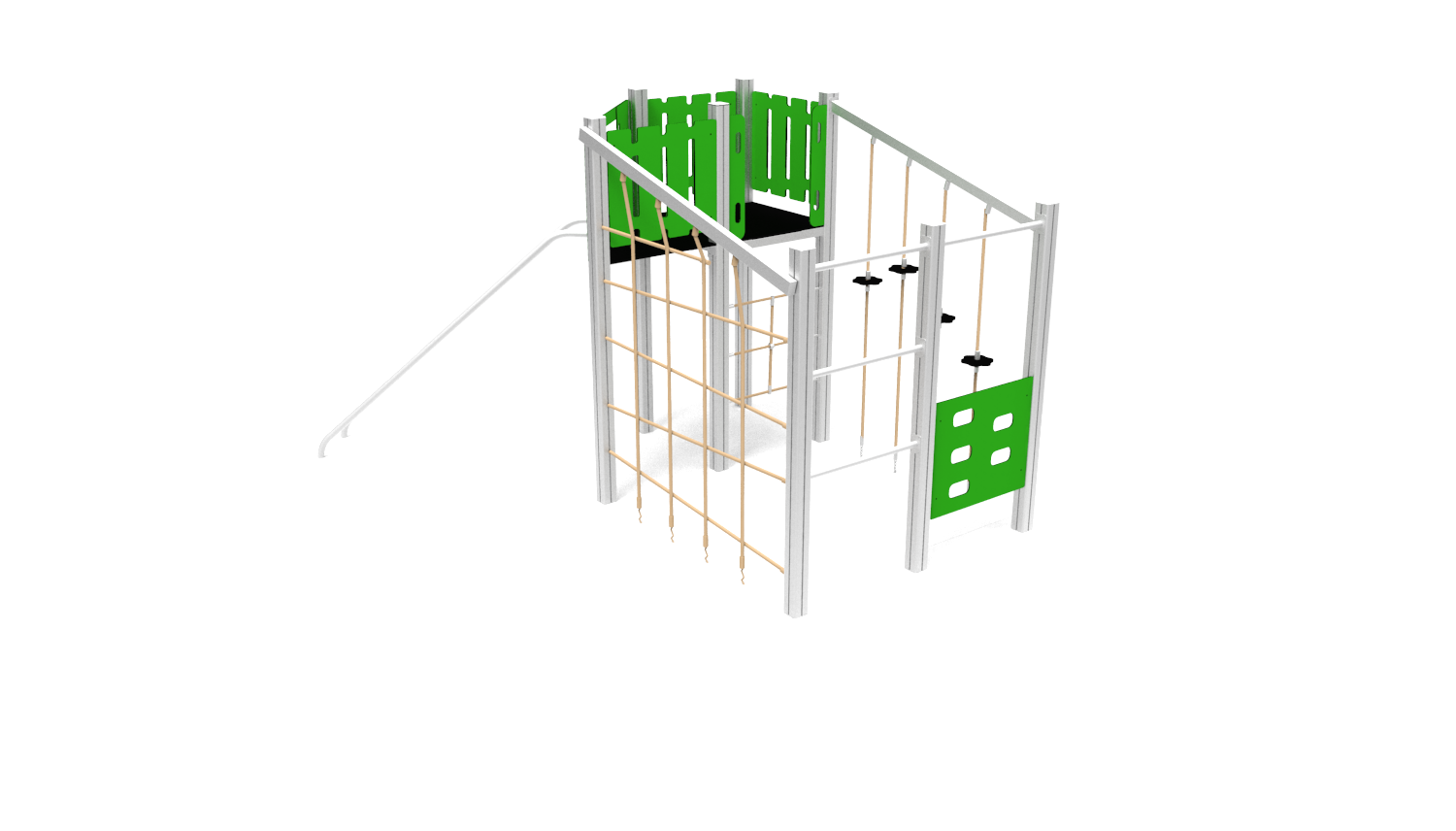 Structural poles: Aluminium profile 90x90 mm with eloxed surface, Platform: steel frame with wood-composite floor 140x24mm , Handles and other steel parts: Steel with zinked layer and coloured powder coating. Roof and side panels: HDPE sheets wit 12, 15 or 19mm thickness. Slide: Polyethylene, Screws: Stainless steel