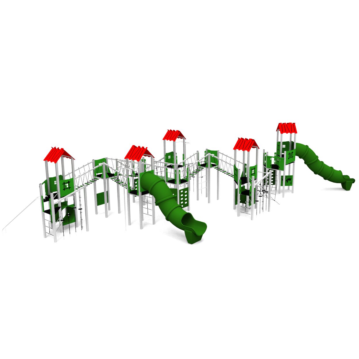 Structural poles: Aluminium profile 90x90 mm with eloxed surface, Platforms / stairs: 12mm anti – slip HPL sheet, with stainless steel supports, Handles and bars: stainless steel 304 or 316 grade, Roof, side panels, walls: UV stabilised 3-layer, bi-color HDPE with inner 100% recycled core in 12, 15 or 19mm thickness. Slide: UV-stabilised Polyethylene (PE), Screws and connecting material: Rope: 16mm PE rope with steel reinforcement