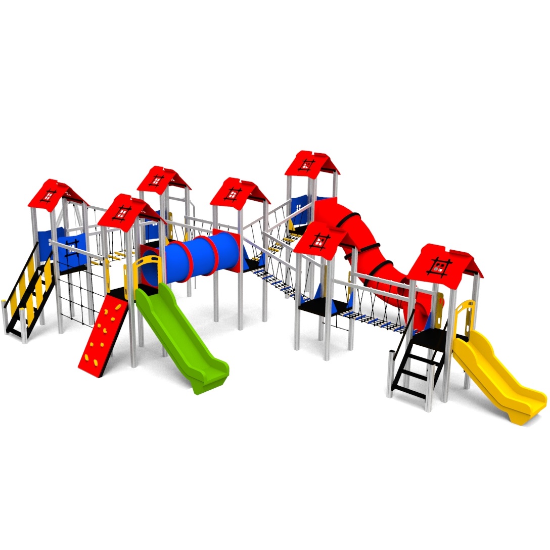 Structural poles: Aluminium profile 90x90 mm with eloxed surface, Platforms / stairs: 12mm anti – slip HPL sheet, with stainless steel supports, Handles and bars: stainless steel 304 or 316 grade, Roof, side panels, walls: UV stabilised 3-layer, bi-color HDPE with inner 100% recycled core in 12, 15 or 19mm thickness. Slide: UV-stabilised Polyethylene (PE), Screws and connecting material: Rope: 16mm PE rope with steel reinforcement