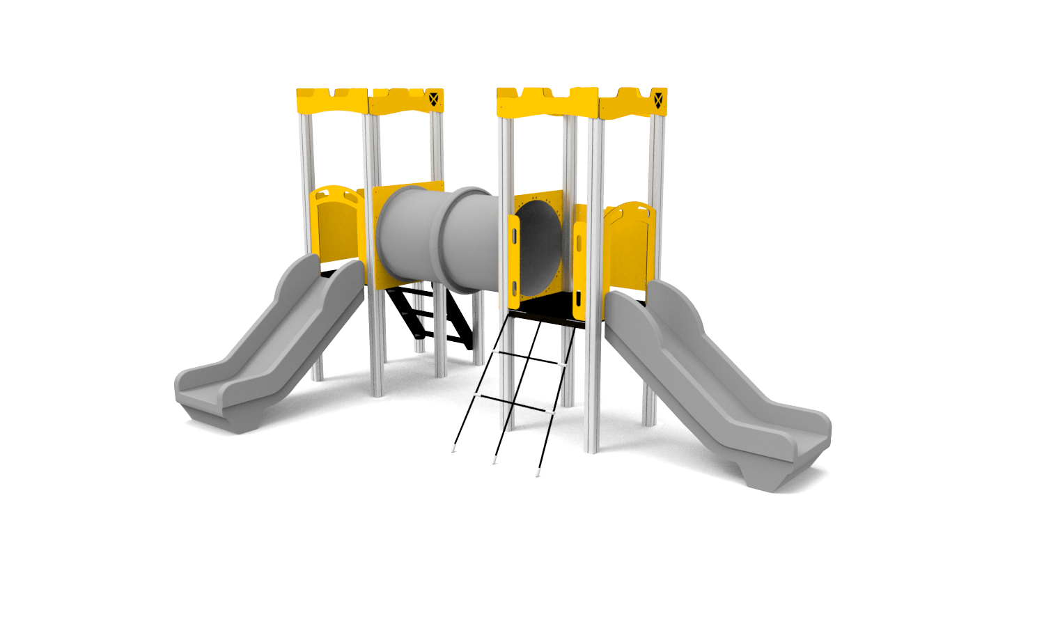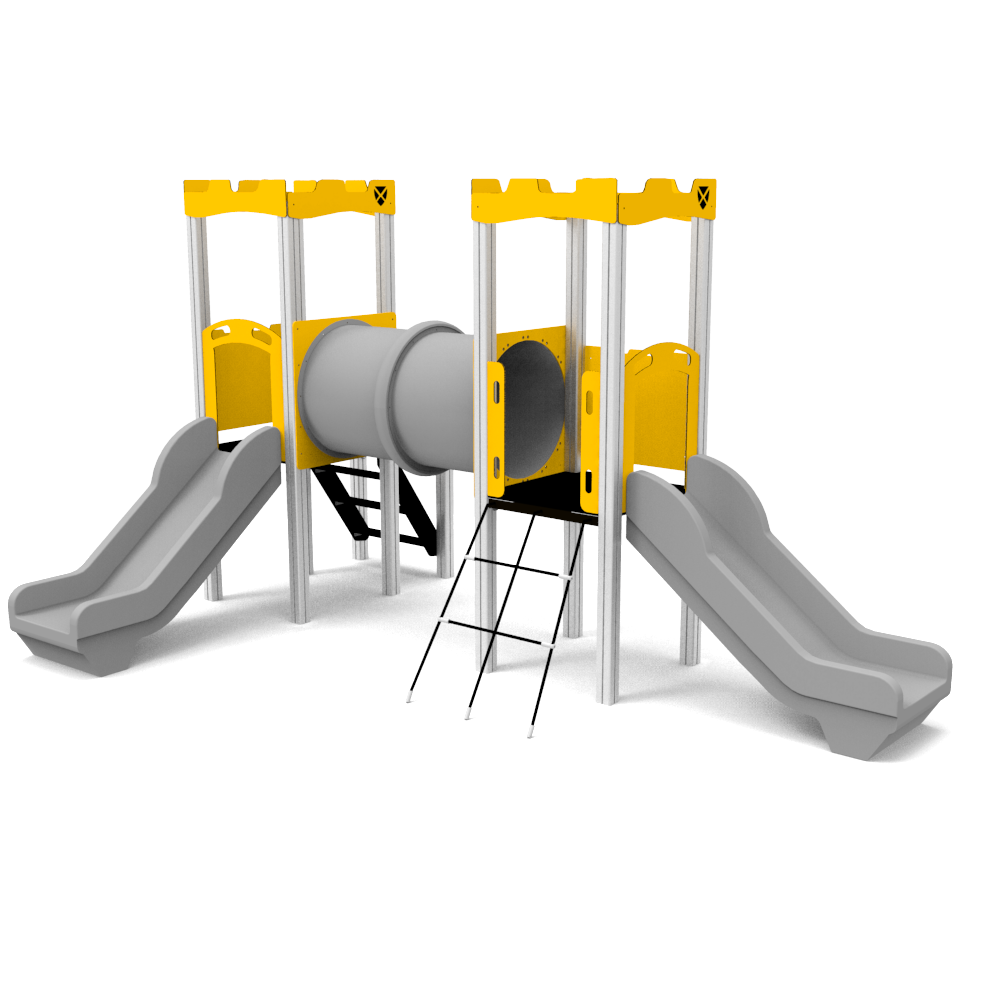 Structural poles: Aluminium profile 90x90 mm with eloxed surface, Platforms / stairs: 12mm anti – slip HPL sheet, with stainless steel supports, Handles and bars: stainless steel 304 or 316 grade, Roof, side panels, walls: UV stabilised 3-layer, bi-color HDPE with inner 100% recycled core in 12, 15 or 19mm thickness. Slide: UV-stabilised Polyethylene (PE), Screws and connecting material: Rope: 16mm PE rope with steel reinforcement
