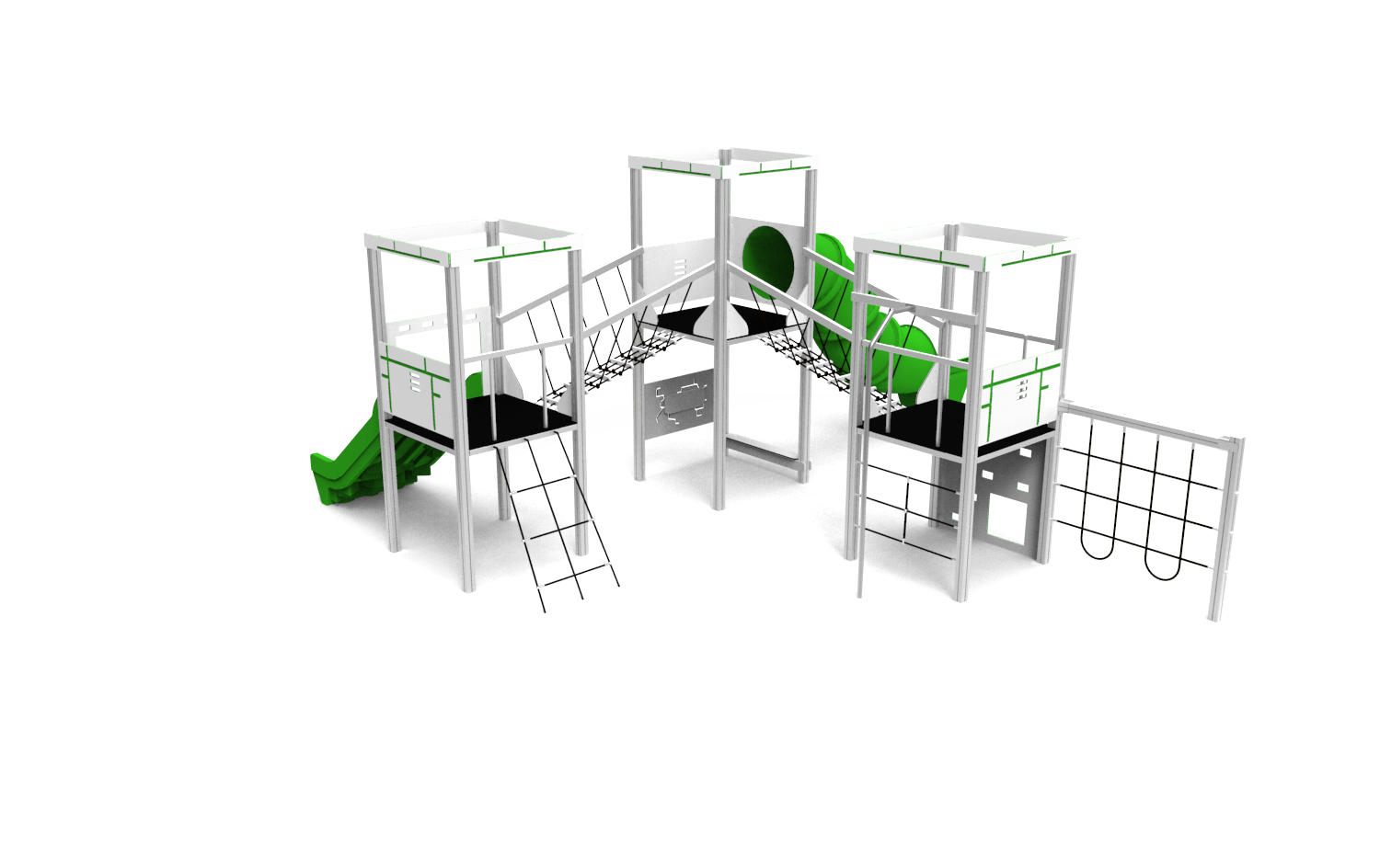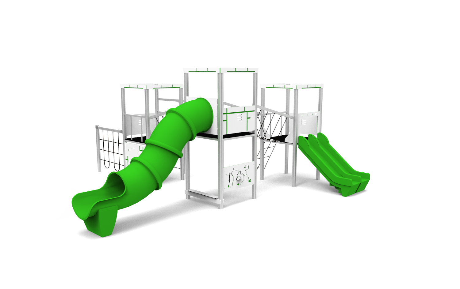 Structural poles: Aluminium profile 90x90 mm with eloxed surface, Platform: alulminium frame with anti-slip HDPE , Stairs: anti.slip HPL, Handles and other steel parts: Stainless steel or aluminium with eloxed surface, Roof and side panels: HDPE sheets wit 12, 15 or 19mm thickness. Slides and Tunels: Polyethylene, Screws: Stainless steel. Rope: 16mm polyamid rope with steel cord