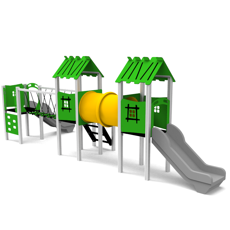 Structural poles: Aluminium profile 90x90 mm with eloxed surface, Platforms / stairs: 12mm anti – slip HPL sheet, with stainless steel supports, Handles and bars: stainless steel 304 or 316 grade, Roof, side panels, walls: UV stabilised 3-layer, bi-color HDPE with inner 100% recycled core in 12, 15 or 19mm thickness. Slide: UV-stabilised Polyethylene (PE), Screws and connecting material: Rope: 16mm PE rope with steel reinforcement