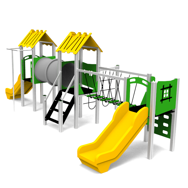 Structural poles: Aluminium profile 90x90 mm with eloxed surface, Platforms / stairs: 12mm anti – slip HPL sheet, with stainless steel supports, Handles and bars: stainless steel 304 or 316 grade, Roof, side panels, walls: UV stabilised 3-layer, bi-color HDPE with inner 100% recycled core in 12, 15 or 19mm thickness. Slide: UV-stabilised Polyethylene (PE), Screws and connecting material: Rope: 16mm PE rope with steel reinforcement