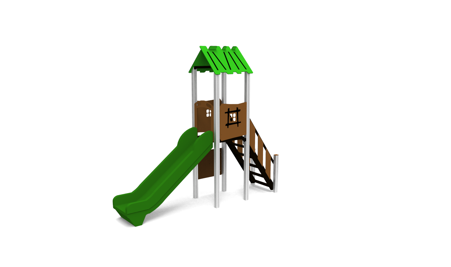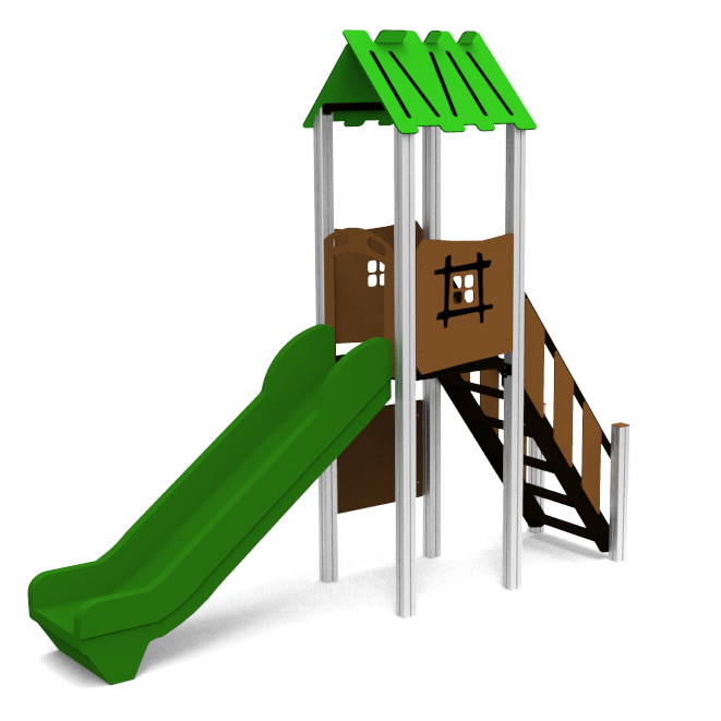 Structural poles: Aluminium profile 90x90 mm with eloxed surface, Platforms / stairs: 12mm anti – slip HPL sheet, with stainless steel supports, Handles and bars: stainless steel 304 or 316 grade, Roof, side panels, climbing walls : UV stabilised 3-layer, bi-color HDPE with inner 100% recycled core in 12, 15 or 19mm thickness. Slide: UV-stabilised Polyethylene (PE), Screws and connecting material: Stainless steel.