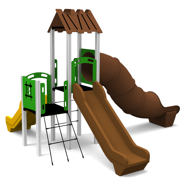 Structural poles: Aluminium profile 90x90 mm with eloxed surface, Platforms / stairs: 12mm anti – slip HPL sheet, with stainless steel supports, Handles and bars: stainless steel 304 or 316 grade, Roof, side panels, walls: UV stabilised 3-layer, bi-color HDPE with inner 100% recycled core in 12, 15 or 19mm thickness. Slide: UV-stabilised Polyethylene (PE), Screws and connecting material: Rope: 16mm PE rope with steel reinforcement