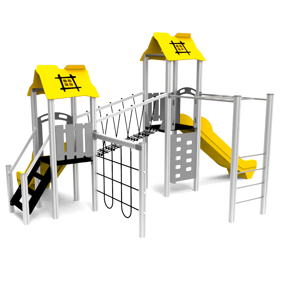 Structural poles: Aluminium profile 90x90 mm with eloxed surface, Platforms / stairs: 12mm anti – slip HPL sheet, with stainless steel supports, Handles and bars: stainless steel 304 or 316 grade, Roof, side panels, walls: UV stabilised 3-layer, bi-color HDPE with inner 100% recycled core in 12, 15 or 19mm thickness. Slide: UV-stabilised Polyethylene (PE), Screws and connecting material: Rope: 16mm PE rope with steel reinforcement