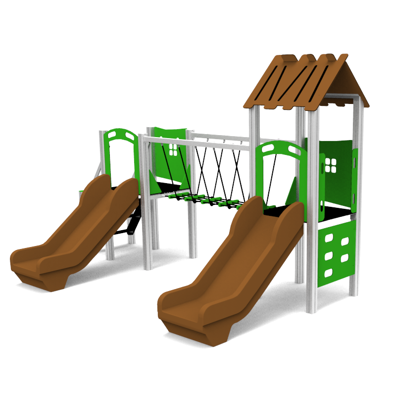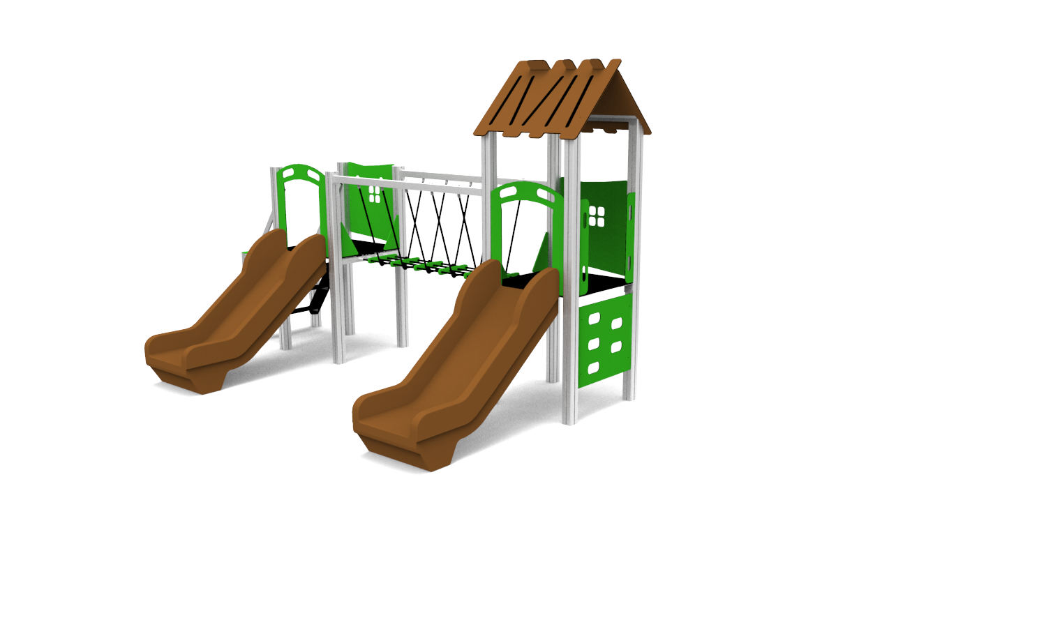 Structural poles: Aluminium profile 90x90 mm with eloxed surface, Platforms / stairs: 12mm anti – slip HPL sheet, with stainless steel supports, Handles and bars: stainless steel 304 or 316 grade, Roof, side panels, walls: UV stabilised 3-layer, bi-color HDPE with inner 100% recycled core in 12, 15 or 19mm thickness. Slide: UV-stabilised Polyethylene (PE), Screws and connecting material: Rope: 16mm PE rope with steel reinforcement