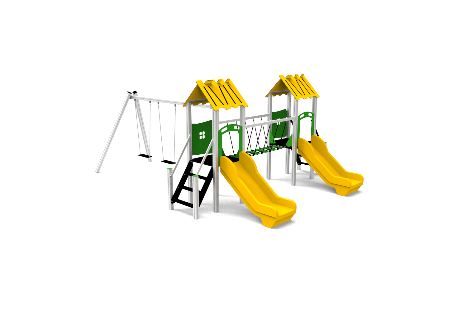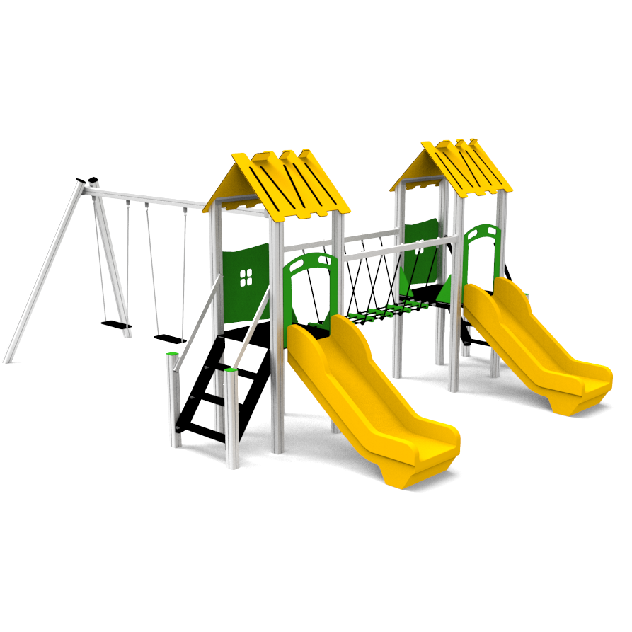 Structural poles: Aluminium profile 90x90 mm with eloxed surface, Platforms / stairs: 12mm anti – slip HPL sheet, with stainless steel supports, Handles and bars: stainless steel 304 or 316 grade, Roof, side panels, walls: UV stabilised 3-layer, bi-color HDPE with inner 100% recycled core in 12, 15 or 19mm thickness. Slide: UV-stabilised Polyethylene (PE), Screws and connecting material: Rope: 16mm PE rope with steel reinforcement