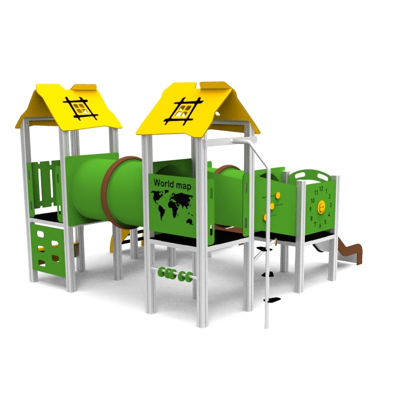 Structural poles: Aluminium profile 90x90 mm with eloxed surface, Platforms / stairs: 12mm anti – slip HPL sheet, with stainless steel supports, Handles and bars: stainless steel 304 or 316 grade, Roof, side panels, walls: UV stabilised 3-layer, bi-color HDPE with inner 100% recycled core in 12, 15 or 19mm thickness. Slide: UV-stabilised Polyethylene (PE), Screws and connecting material: Rope: 16mm PE rope with steel reinforcement
