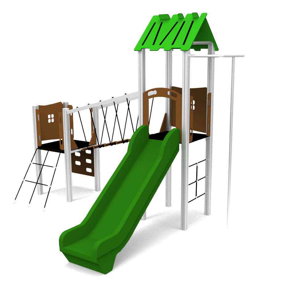 Structural poles: Aluminium profile 90x90 mm with eloxed surface, Platforms / stairs: 12mm anti – slip HPL sheet, with stainless steel supports, Handles and bars: stainless steel 304 or 316 grade, Roof, side panels, walls: UV stabilised 3-layer, bi-color HDPE with inner 100% recycled core in 12, 15 or 19mm thickness. Slide: UV-stabilised Polyethylene (PE), Screws and connecting material: Rope: 16mm PE rope with steel reinforcement