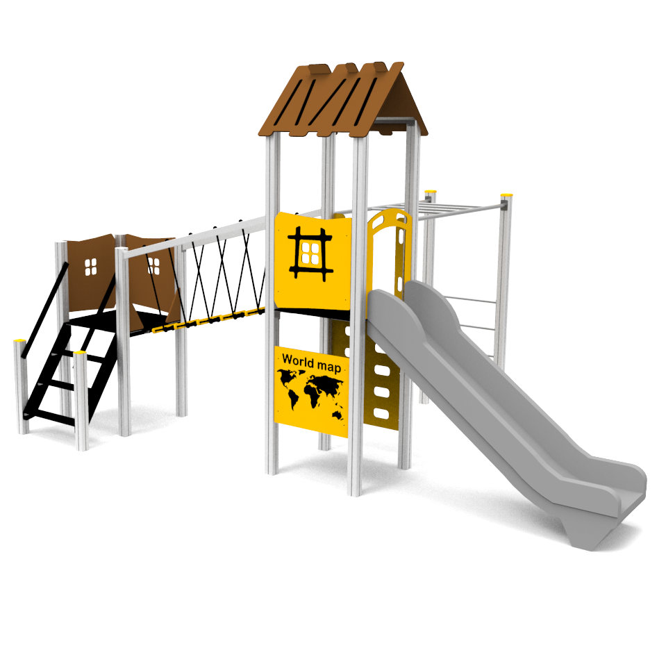Two towers with various platform heights connected with a rope bridge, stairs, slide, climber, interactive panel and monkeys bar - action packed play options in a compact format.